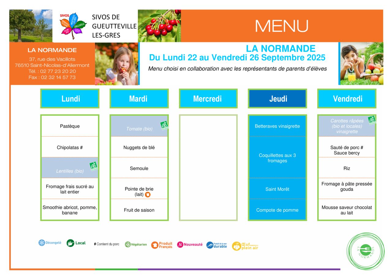 Vous trouverez en pièce jointe le menu de la cantine du lundi 22 au vendredi 26 septembre 2025.