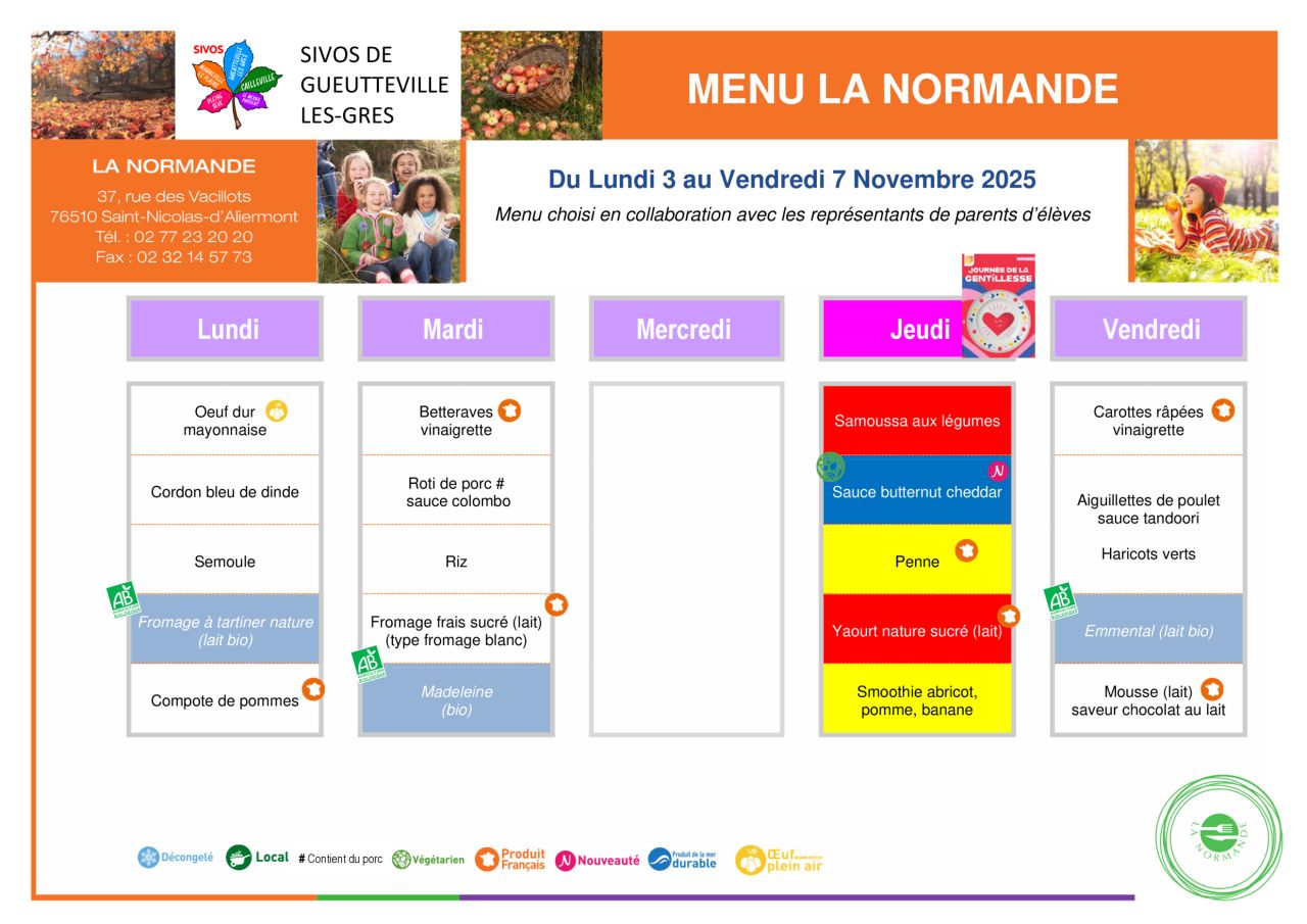 Vous trouverez en pièce jointe le menu de la cantine du lundi 3 au vendredi 7 novembre 2025.
